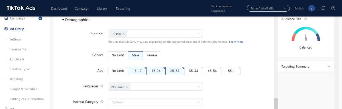 Есть возможность выбрать гендерные и возрастные характеристики аудитории во вкладке Demographics, а также язык общения.